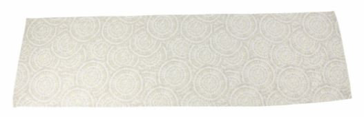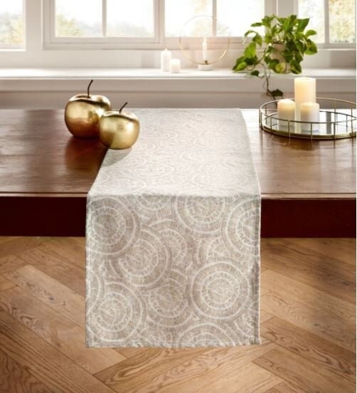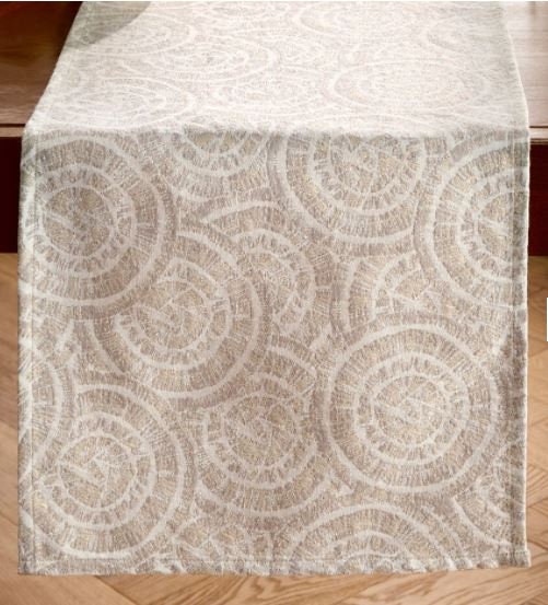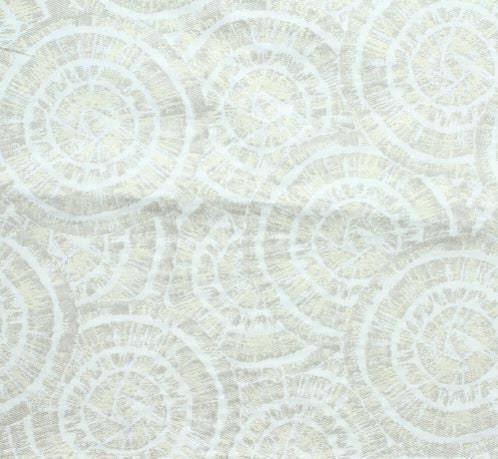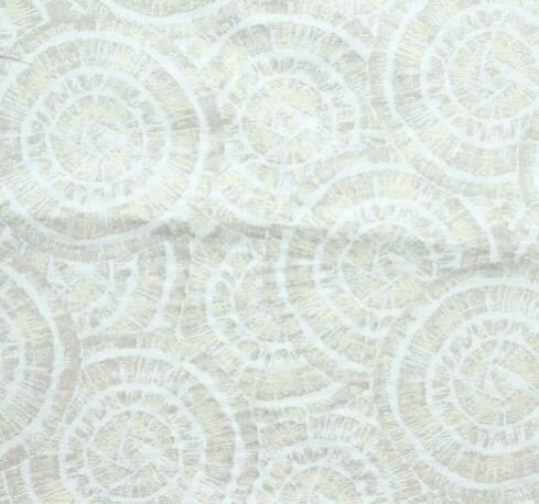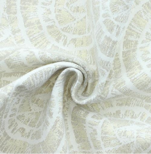 beige basic fabric with shiny accents in form of golden circles made of 66% polyester, 26% cotton, 2 % polyacrylic, 2 % polyamide, 4 % metallic fibres