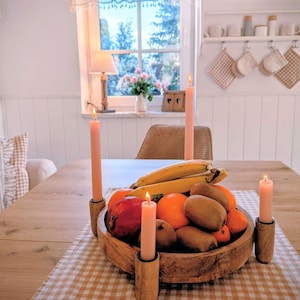 a really useful and yet pretty element, this deco board completely environmentally conscious upcycling won from pallet wood, each piece a unique specimen, natural coloured, round shape with furniture-protecting plastic knobs. Whether as a trivet or as a decorative board, it will be a focal point in any case.