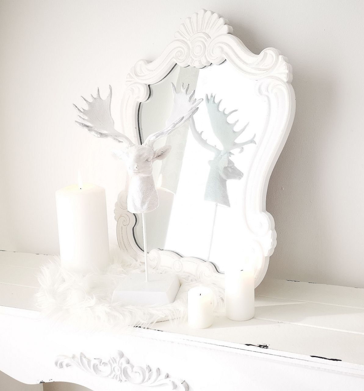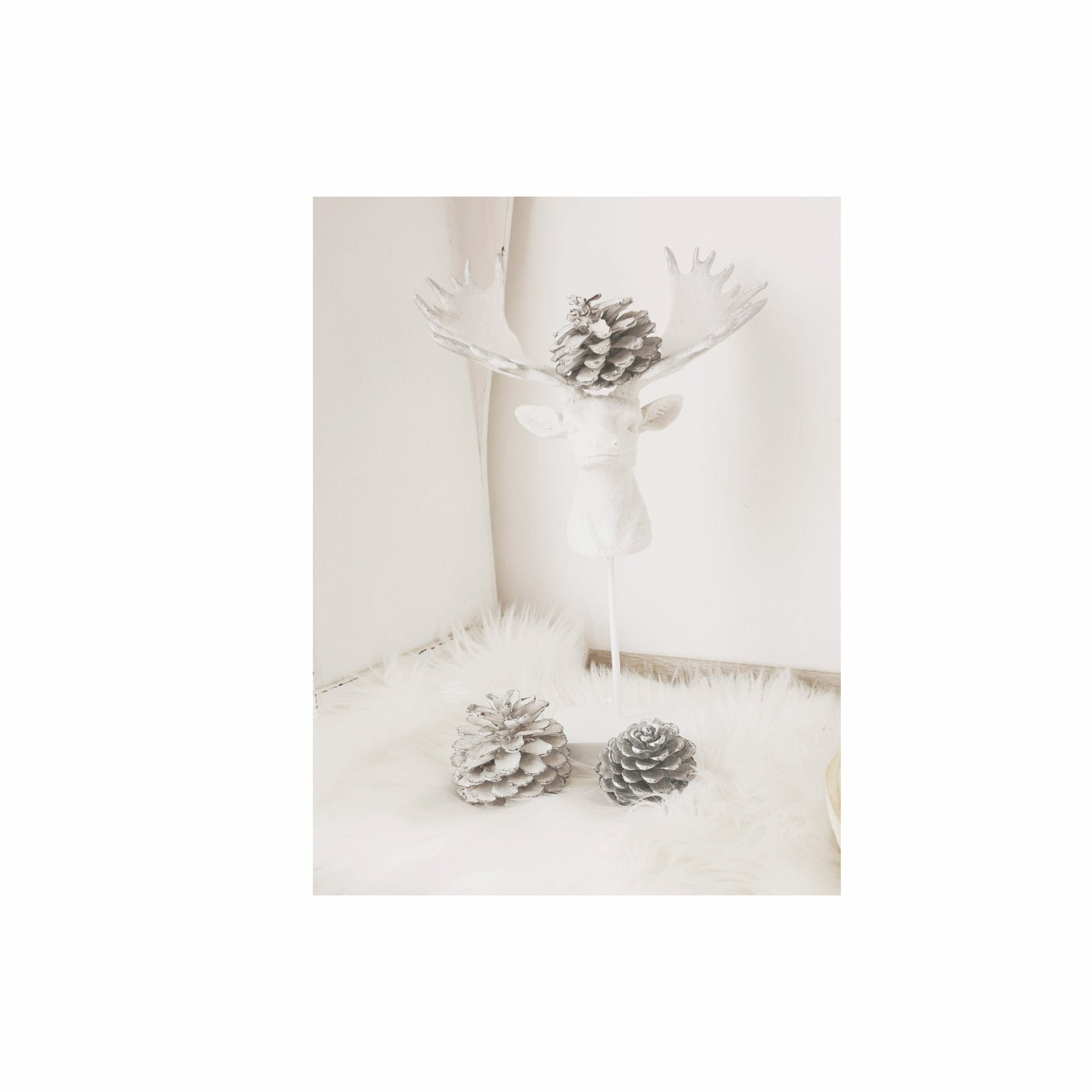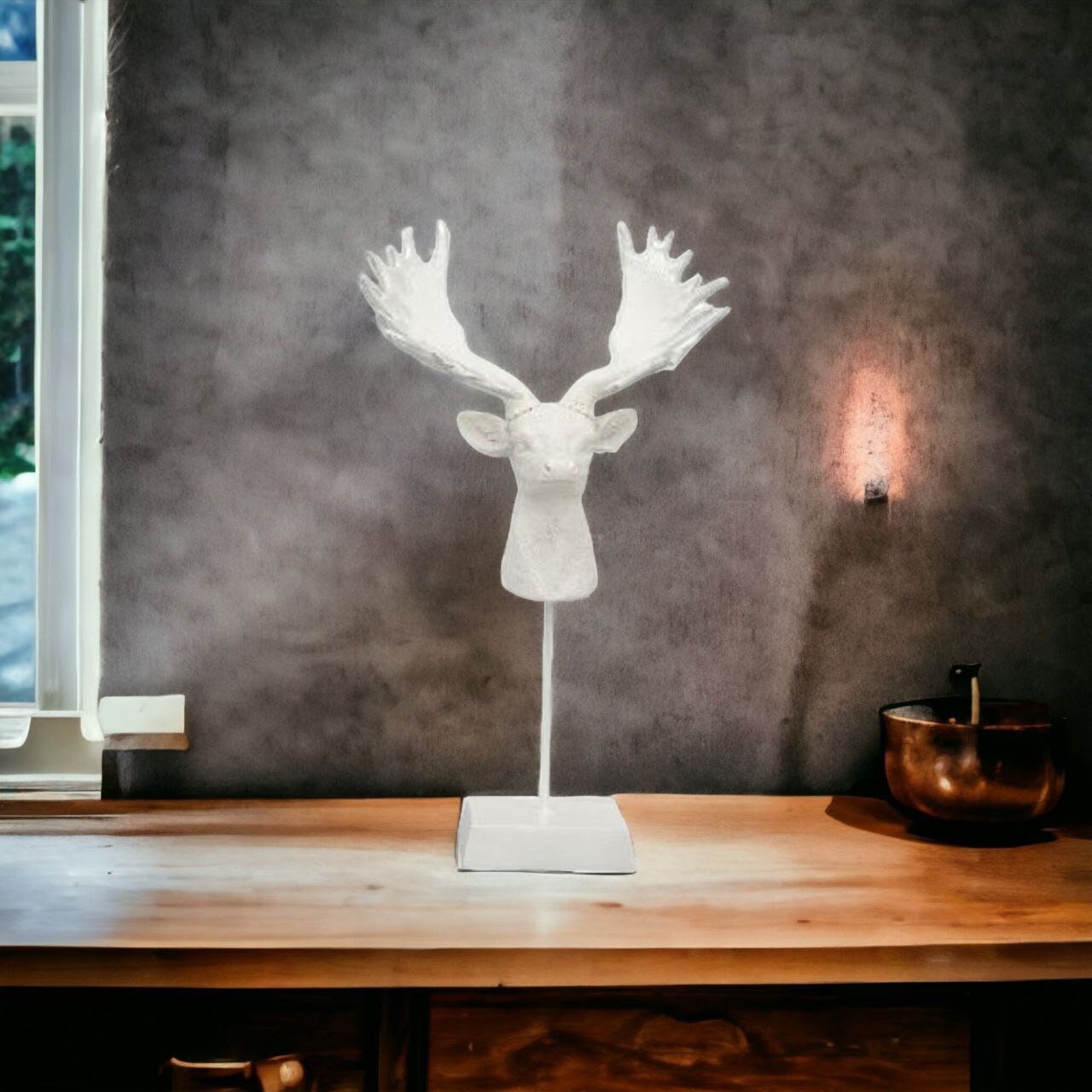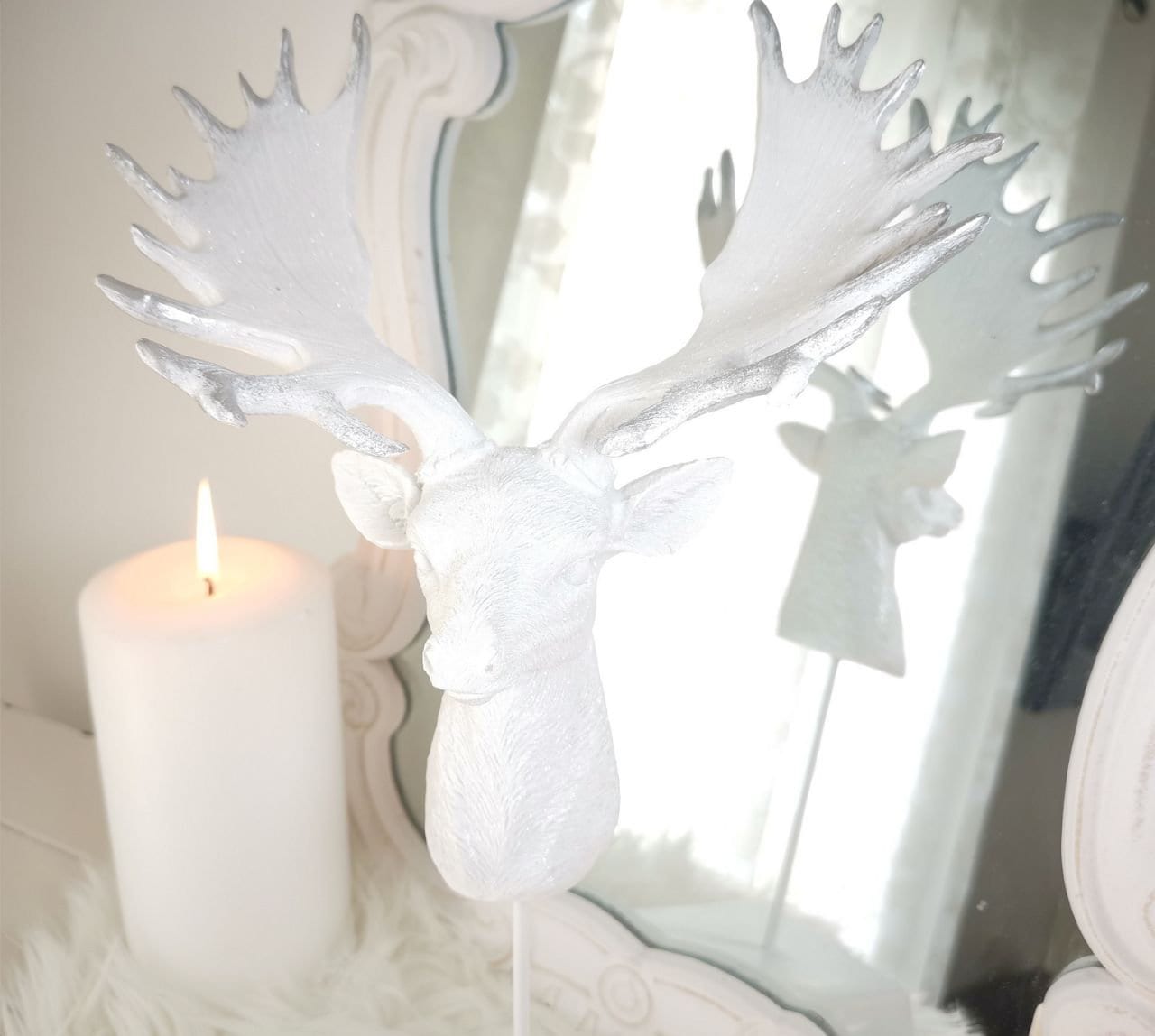 Enchanting white reindeer head lily fairy on stand in good heavy quality with light glitter finish made of polyresin.
