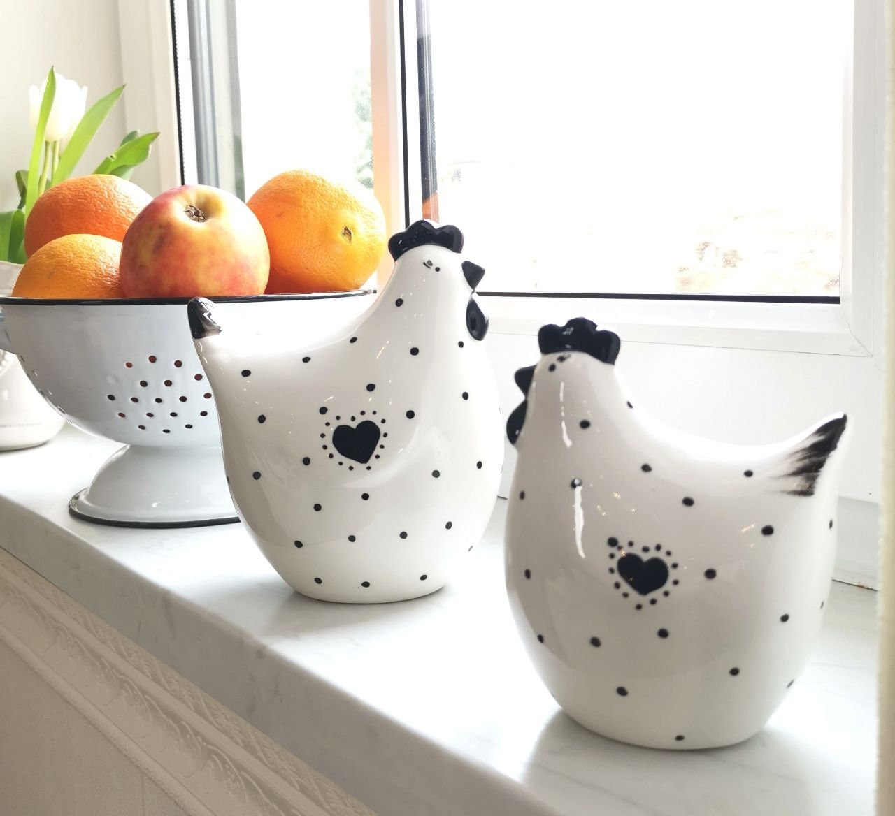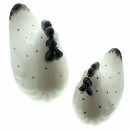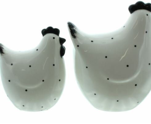 Niedliche Keramikhühner, das Pünktchen-Muster in der Glasur war allerdings nicht ganz so dezent/filigran gezeichnet wie auf der Abbildung, dennoch tolle Osterdeko, schnelle Lieferung in bruchsicherer Verpackung