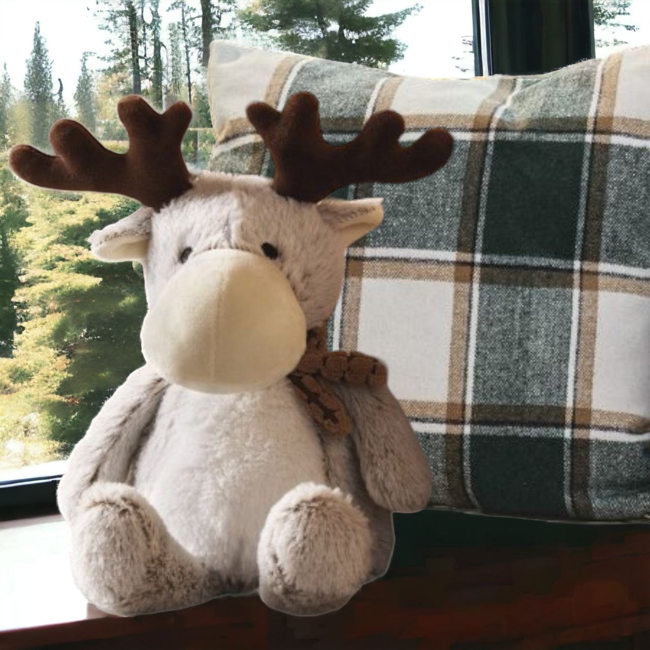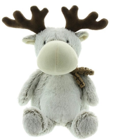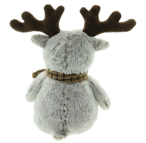 Made from light gray white fluffy fabric with brown antlers, filled with heavy sand so the figure fits beautifully and made from 100% polyester.