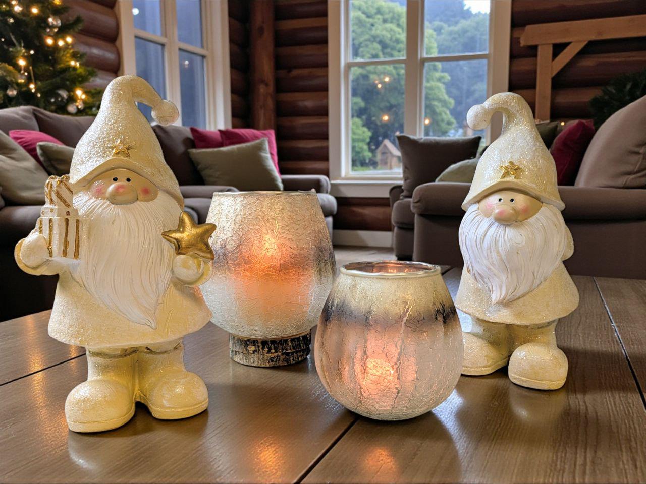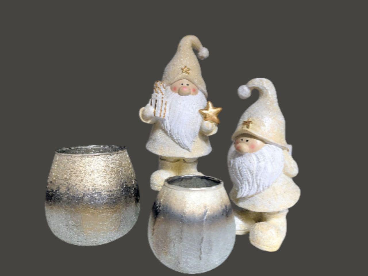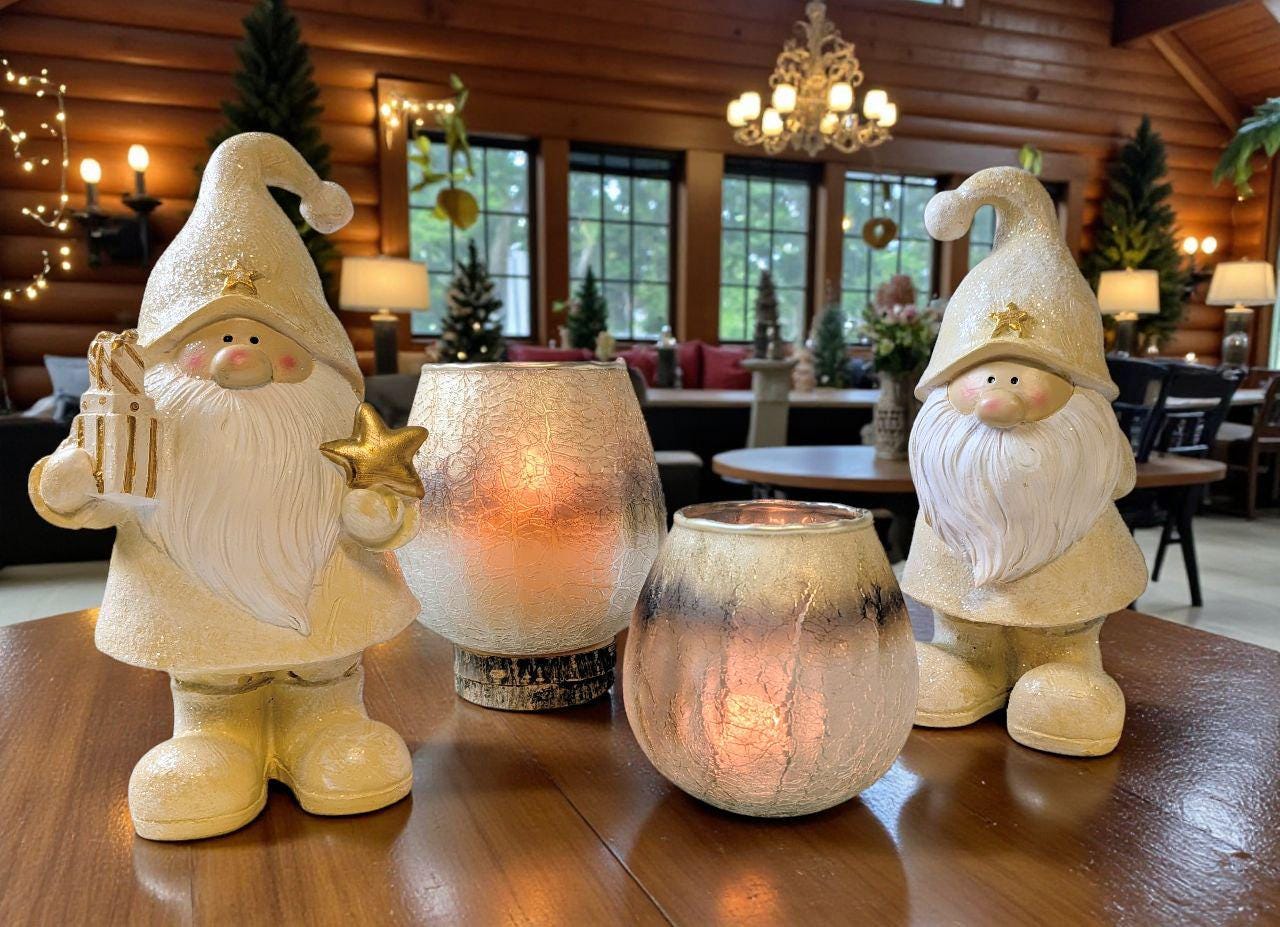 Adorable Santa Clauses made of polyresin in cream white with golden accents, slightly glittering and incredibly charming to look at, instantly transported me to a magical Christmas world when I saw these cute Santa Clauses standing there.