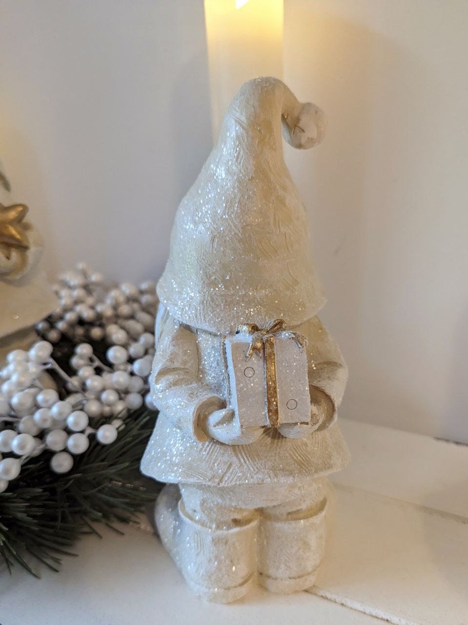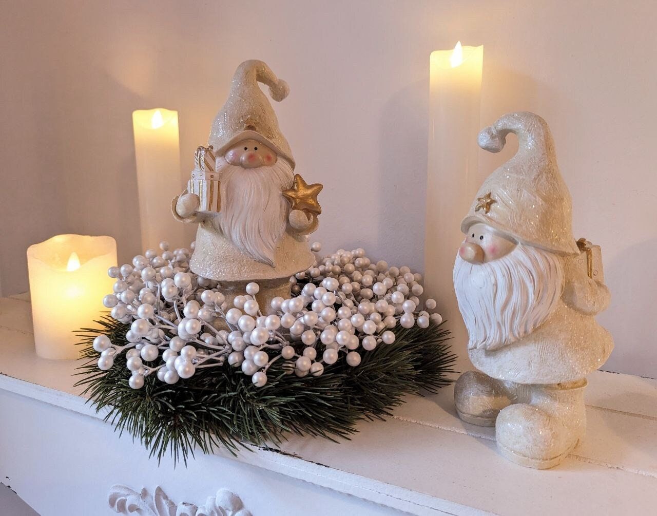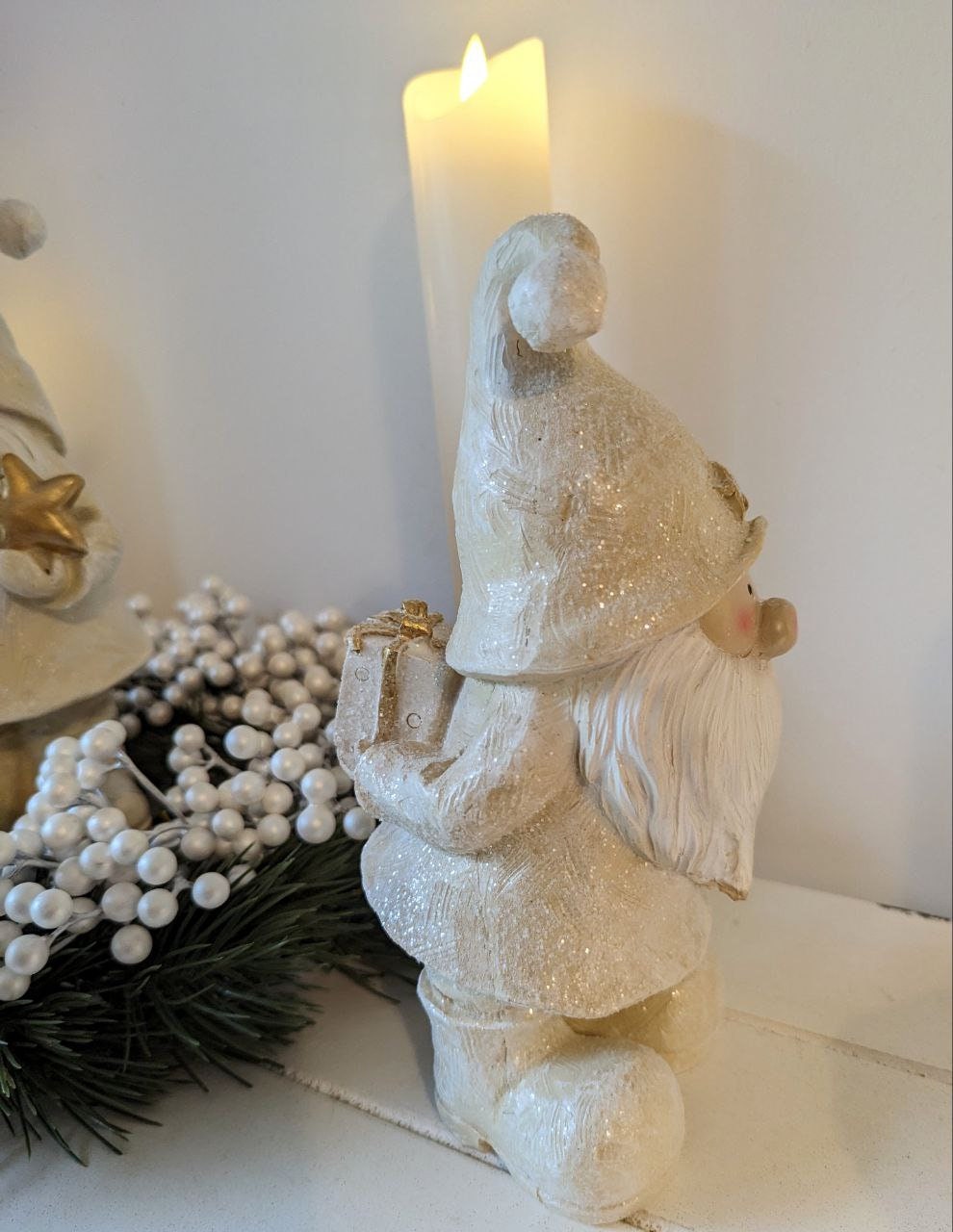 Adorable Santa Clauses made of polyresin in cream white with golden accents, slightly glittering and incredibly charming to look at, instantly transported me to a magical Christmas world when I saw these cute Santa Clauses standing there.