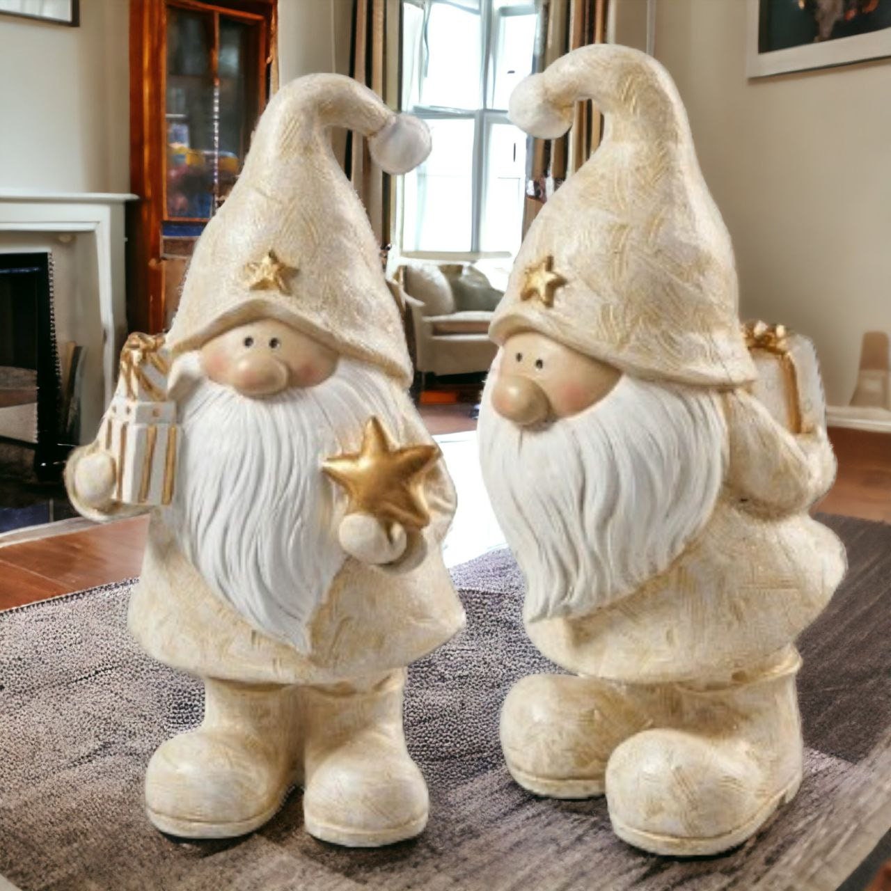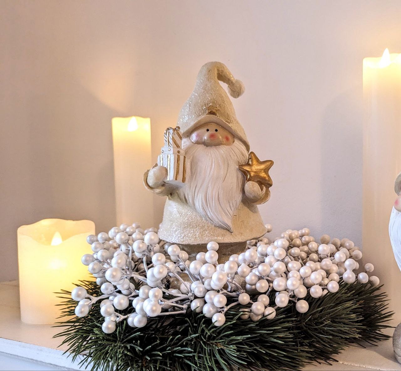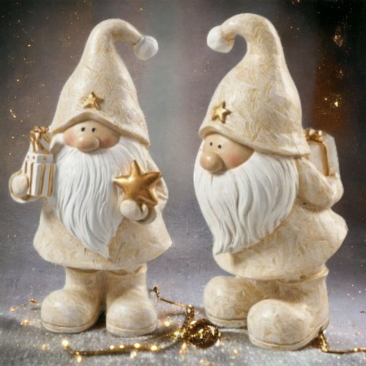 Adorable Santa Clauses made of polyresin in cream white with golden accents, slightly glittering and incredibly charming to look at, instantly transported me to a magical Christmas world when I saw these cute Santa Clauses standing there.