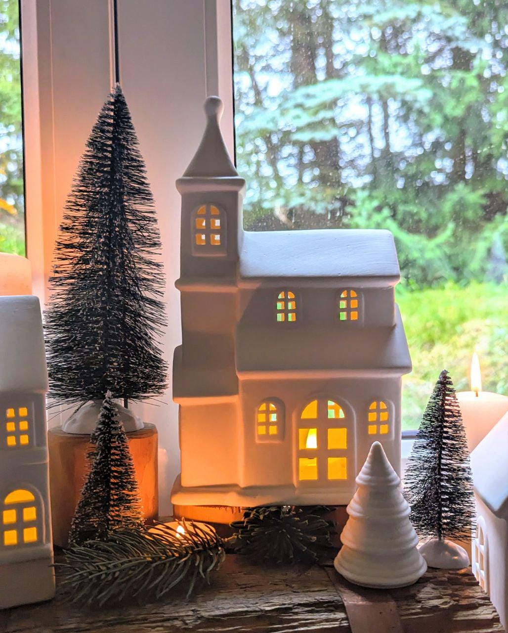 Schöne kleine Kirche für ein Häuserdorf auf der Fensterbank