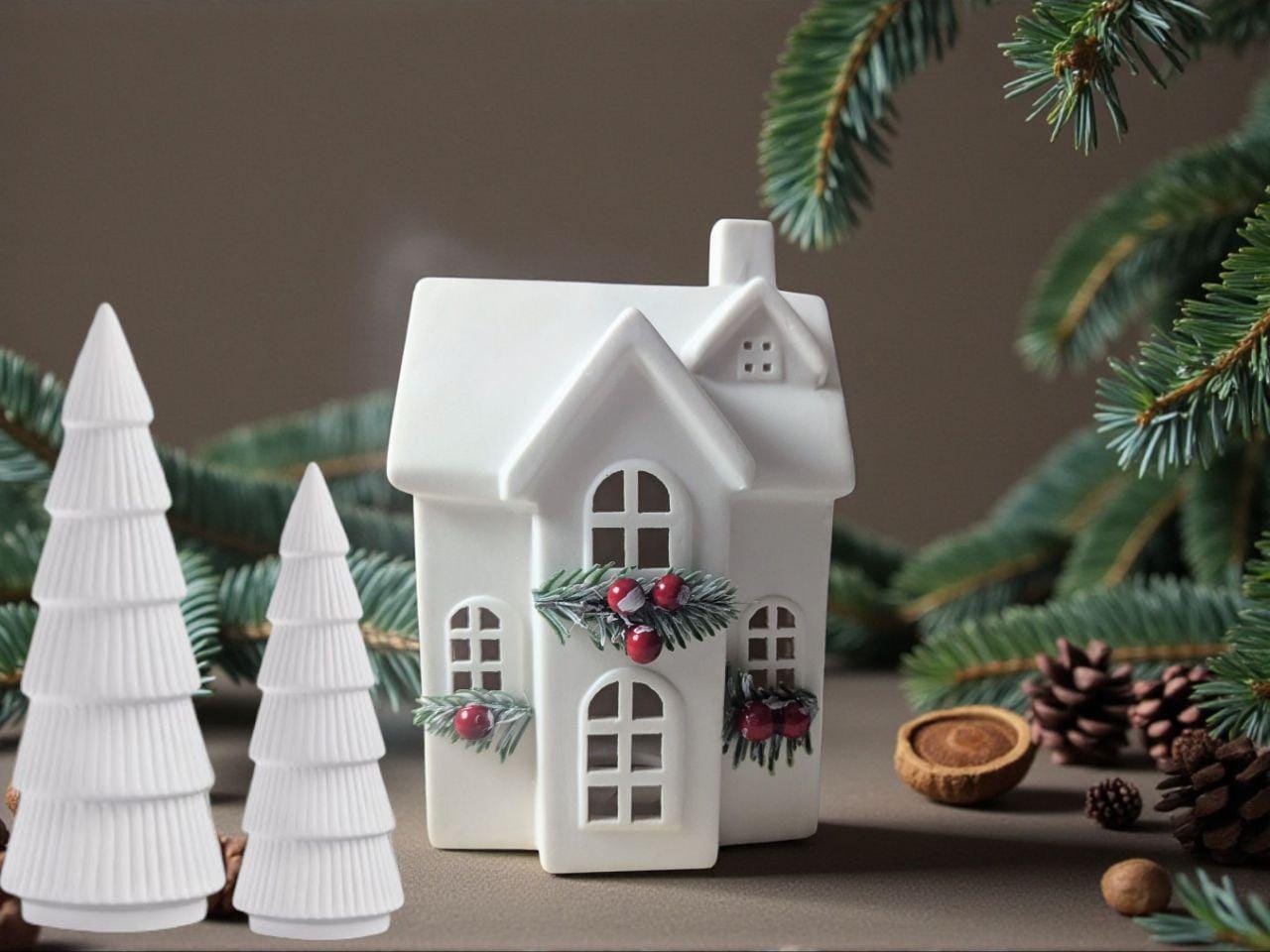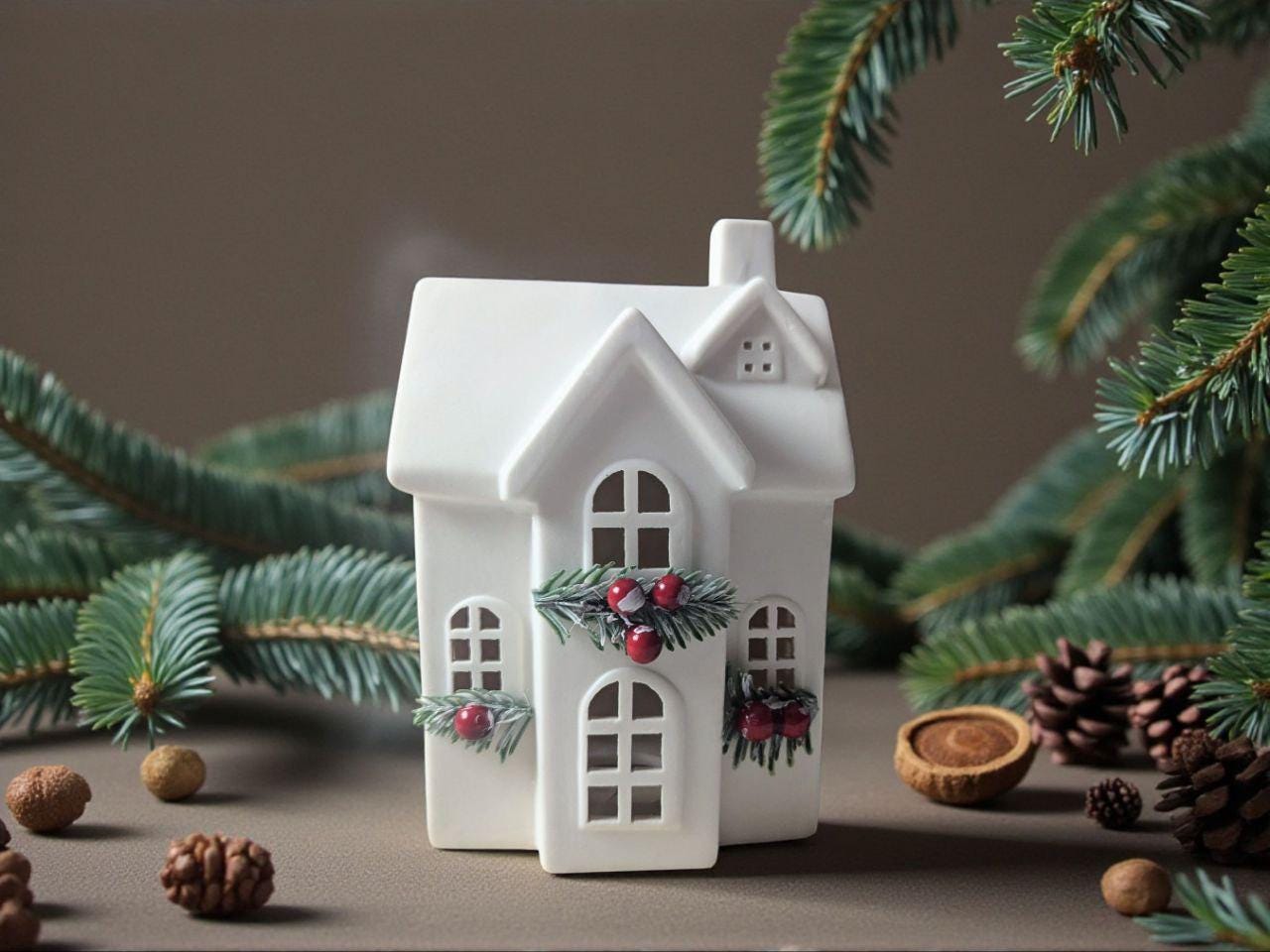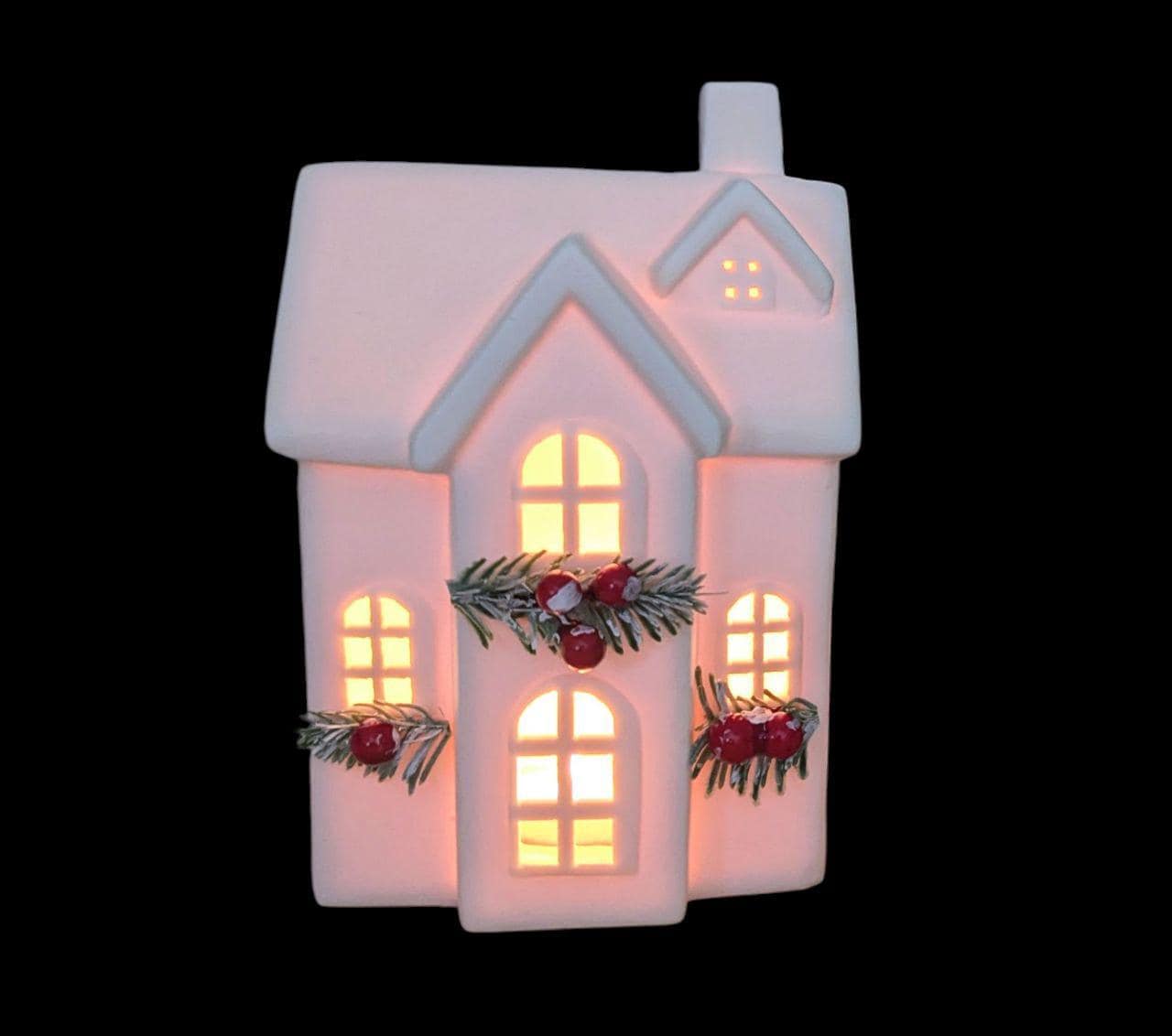 Light house No. 7 with branches, white ceramic, Christmas candle house, Advent house, light house, candlestick, tea light house