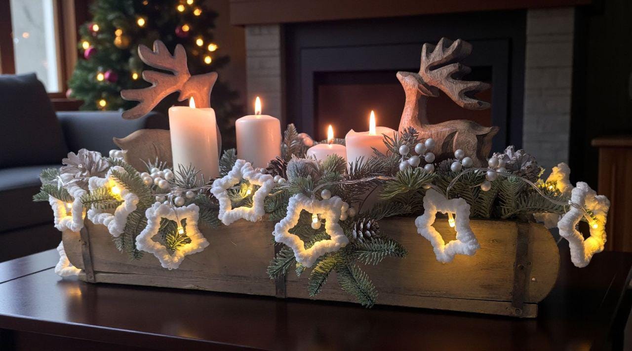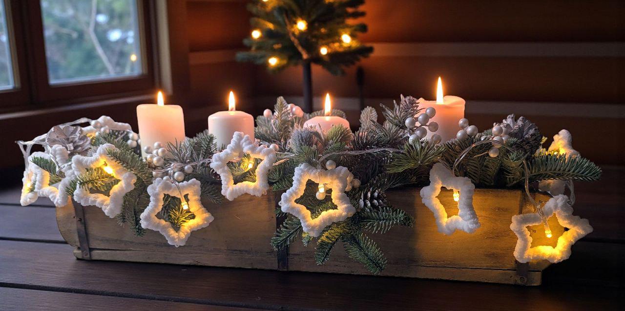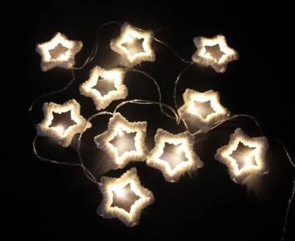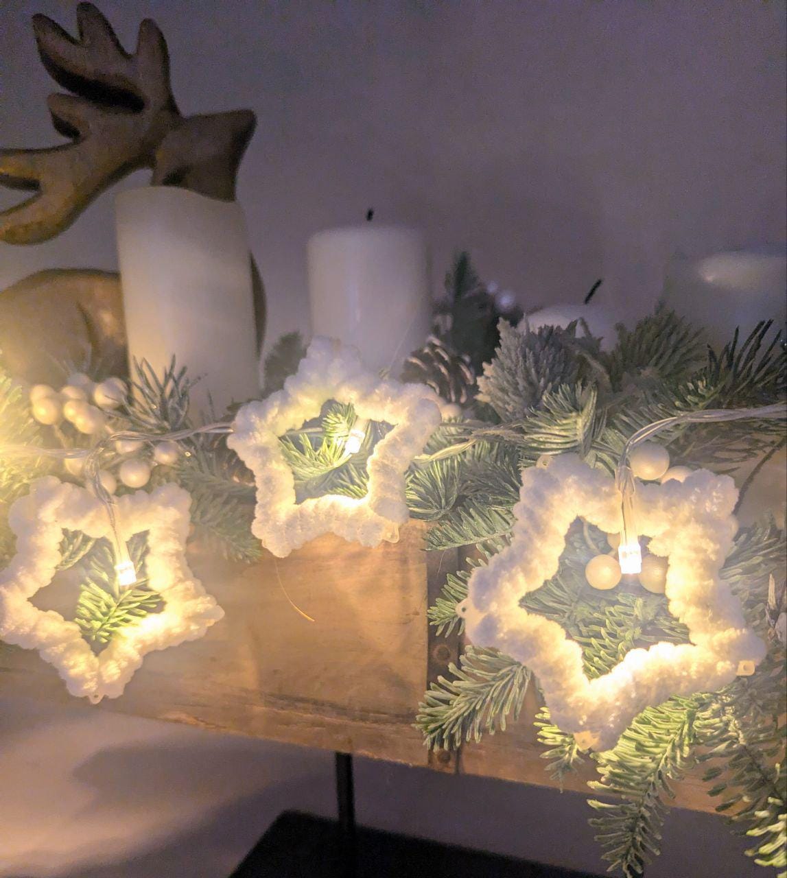 The ‘Stars’ LED string lights bring a touch of magic to any room. Delicate white plastic stars – lovingly wrapped in soft, fluffy chenille yarn – spread a gentle, cosy light thanks to 10 warm white LEDs. Whether in the window, on a wooden board or as a festive decoration on the table, this string of lights creates a cosy atmosphere, especially at this time of year. Thanks to its battery operation and practical on/off switch, it can be placed anywhere – without the need for a nearby power socket. Atmospheric lighting decoration for indoor use Stars made of white plastic, wrapped in soft, fluffy white chenille Battery operated (with on/off switch) 10 warm white LEDs Length 135 cm, cable 50 cm, batteries not included Delivered without decoration
