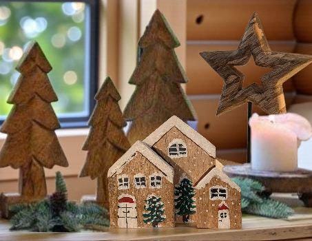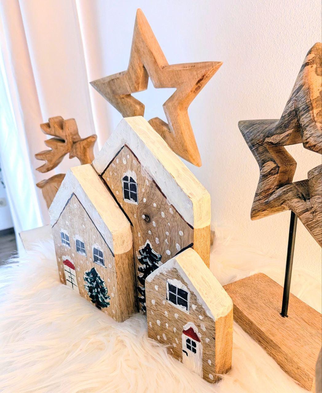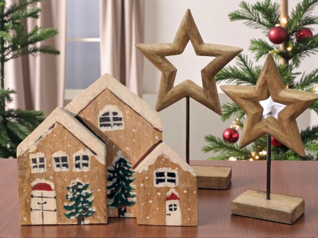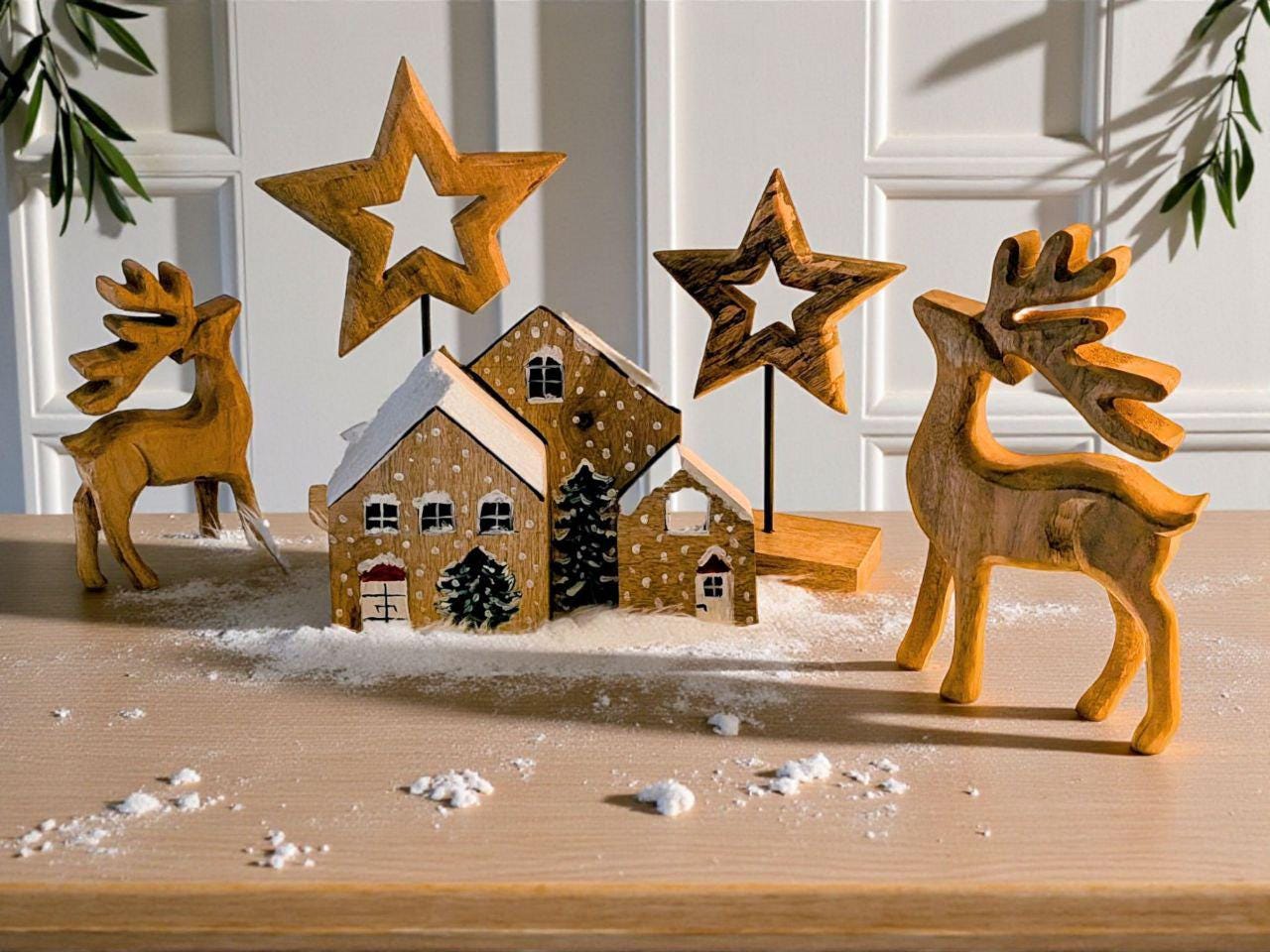 Bring natural warmth to your winter and Christmas decorations: This elegant set consists of 2 artfully crafted stars on a stand in different sizes and a hand-painted wooden house assembled in 3 parts.