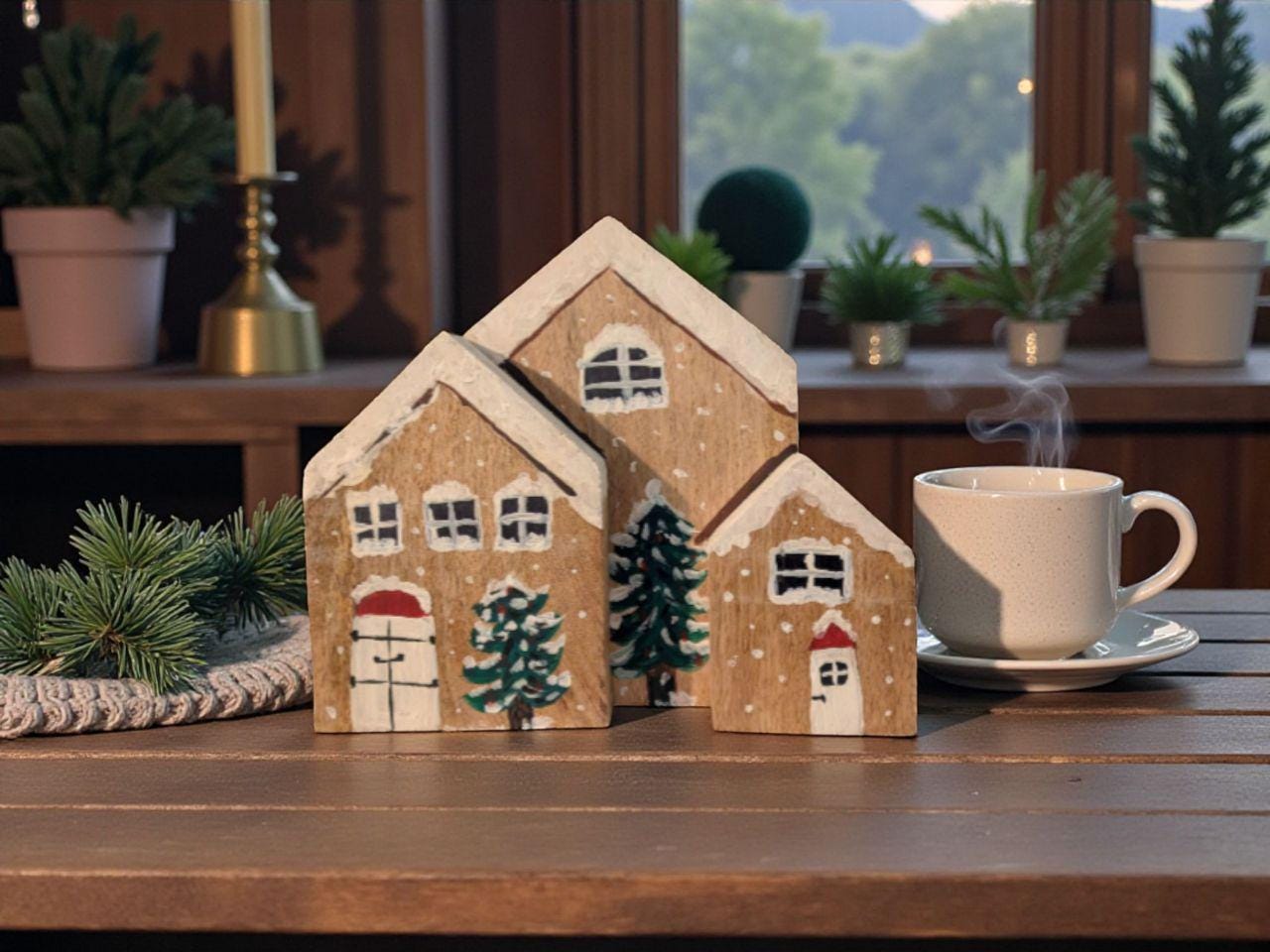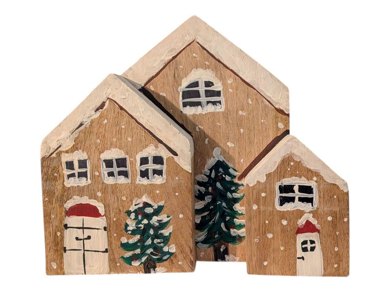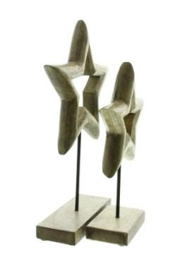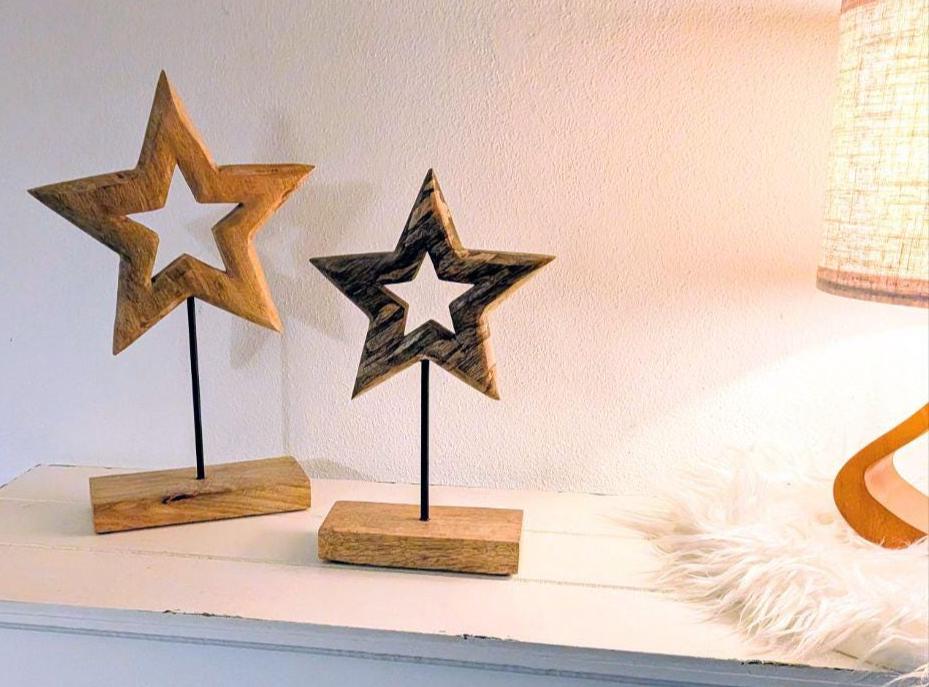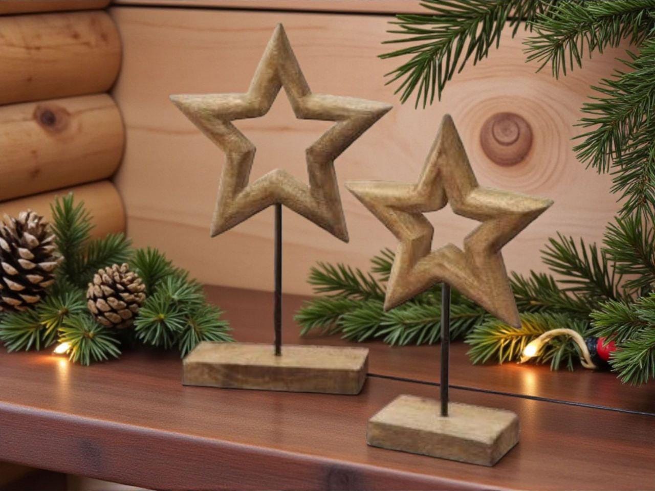 Bring natural warmth to your winter and Christmas decorations: This elegant set consists of 2 artfully crafted stars on a stand in different sizes and a hand-painted wooden house assembled in 3 parts.