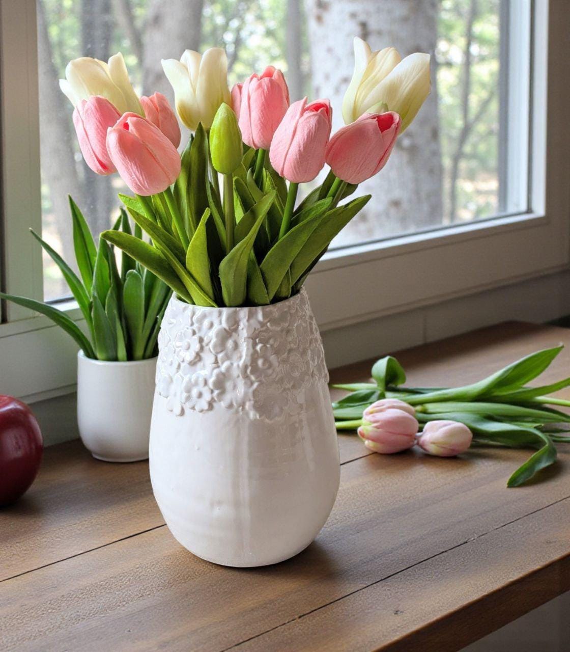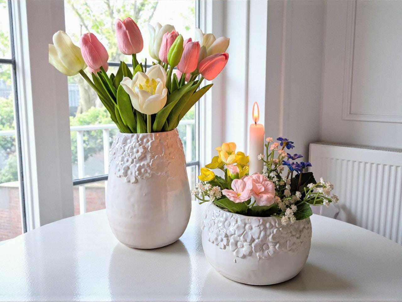 These beautiful, handcrafted plant pots and vases impress with their wide, lovingly designed floral rim, which lends them a particularly charming and playful appeal. The elegant white ceramic ensures a stylish look and can be combined in a variety of ways.