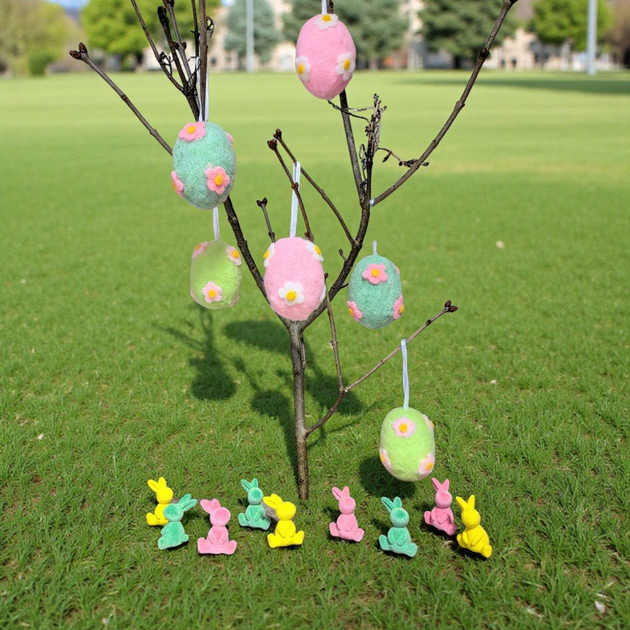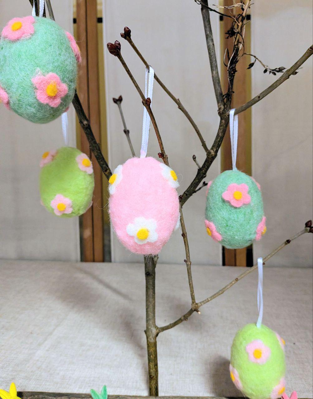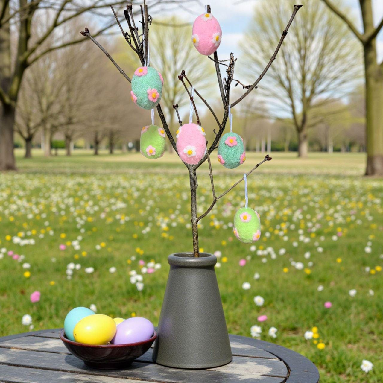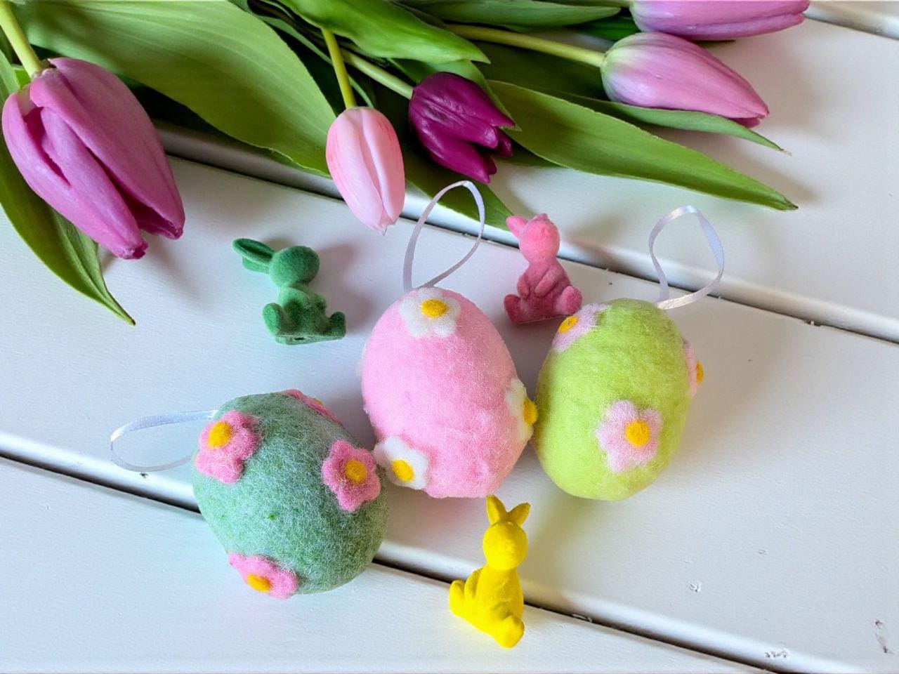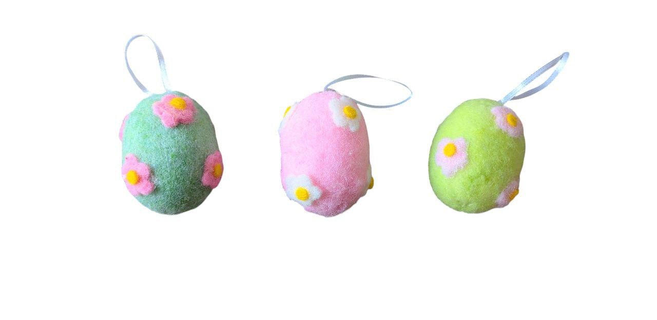 Set of 3 felt Easter eggs with delicate felt flowers in petrol blue, green, and pink These adorable Easter eggs bring spring right into your home. Soft and wonderfully fluffy, they enchant with their lovely felt flowers and harmonious, spring-like colors. Whether as a table decoration, in an Easter basket, on the windowsill, or as a thoughtful gift, this set creates a warm, cozy Easter atmosphere and can be beautifully combined with other spring and Easter decorations. Velvety soft felt Lovingly decorated with felt flowers Delicate, spring-like colors An enchanting decorative highlight for anyone who loves Easter in a natural, playful, and stylish way Dimensions 6 x 8 cm