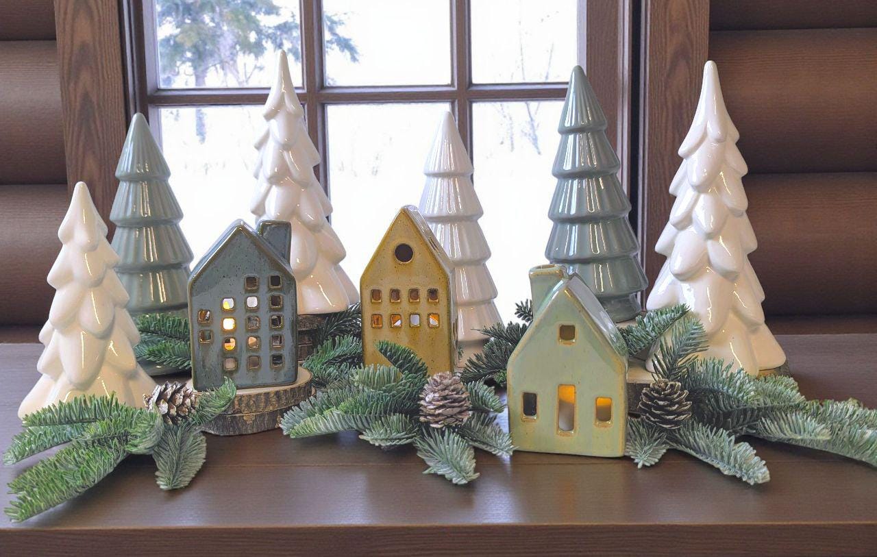 Elegant porcelain fir trees – in various sizes and colours ✨ These beautiful fir trees made of high-quality porcelain with a glazed surface bring festive elegance to your home. Available in two sizes and two colour variations, they can be combined according to your taste and create an atmospheric ambience during Advent and Christmas. Whether as a stylish single piece, harmoniously paired or combined with other decorative elements, these fir trees are a timeless eye-catcher on the dining table, windowsill or sideboard. Thanks to their elegant workmanship and versatile uses, they suit both modern and classic interior styles. They look particularly beautiful with light houses, candles or natural materials such as fir branches and pine cones. An elegant decorative highlight that you will love to bring out again and again every year during the winter and Christmas season. Dimensions: Small white fir tree Height 15.5 cm x DM 8.5 cm Large white fir tree Height 22.0 cm x DM 11.0 cm Large green ribbed fir tree 21.0 cm x 10.0 cm Large white ribbed fir tree 21.0 cm x 10.0 cm 3 candle houses (ochre, sage green and blue) Dimensions: height 2 x 10 cm and 1 x 13 cm You can get a matching set of 3 light houses at the following item link: Delivered without decorations.