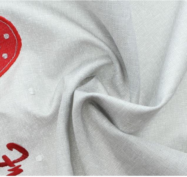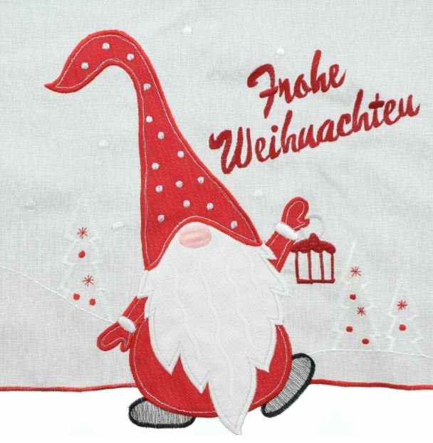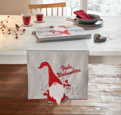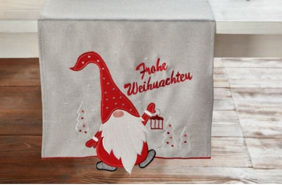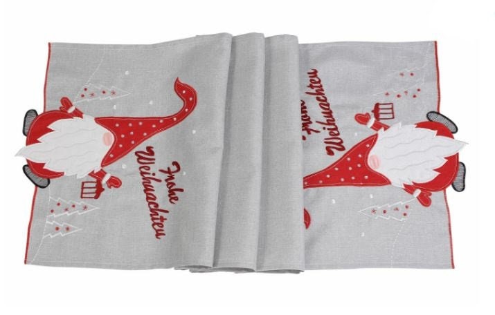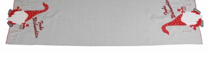 cute table runner with a gnome made of grey basic fabric, interwoven with silver threads and decorative embroidery 100 % polyester
