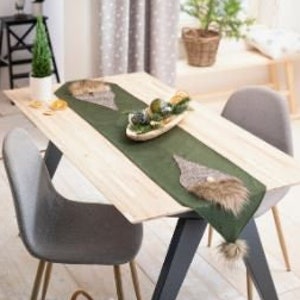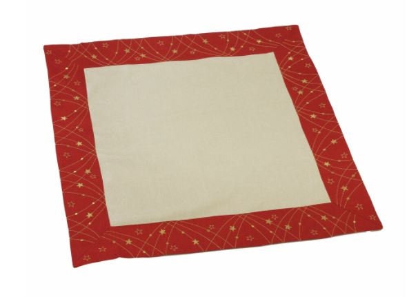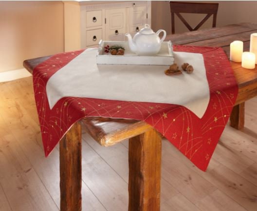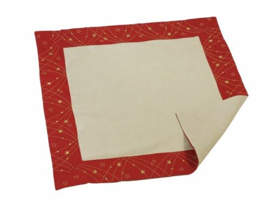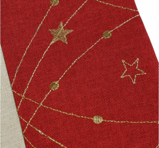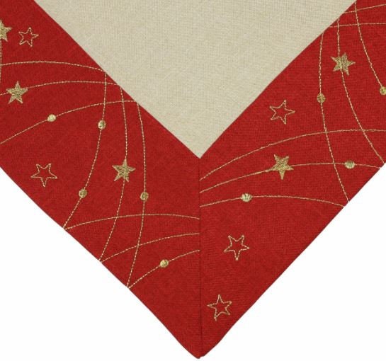 in classic Christmas colours, beige base fabric with red border and elaborate embroidery in shiny gold tone,
